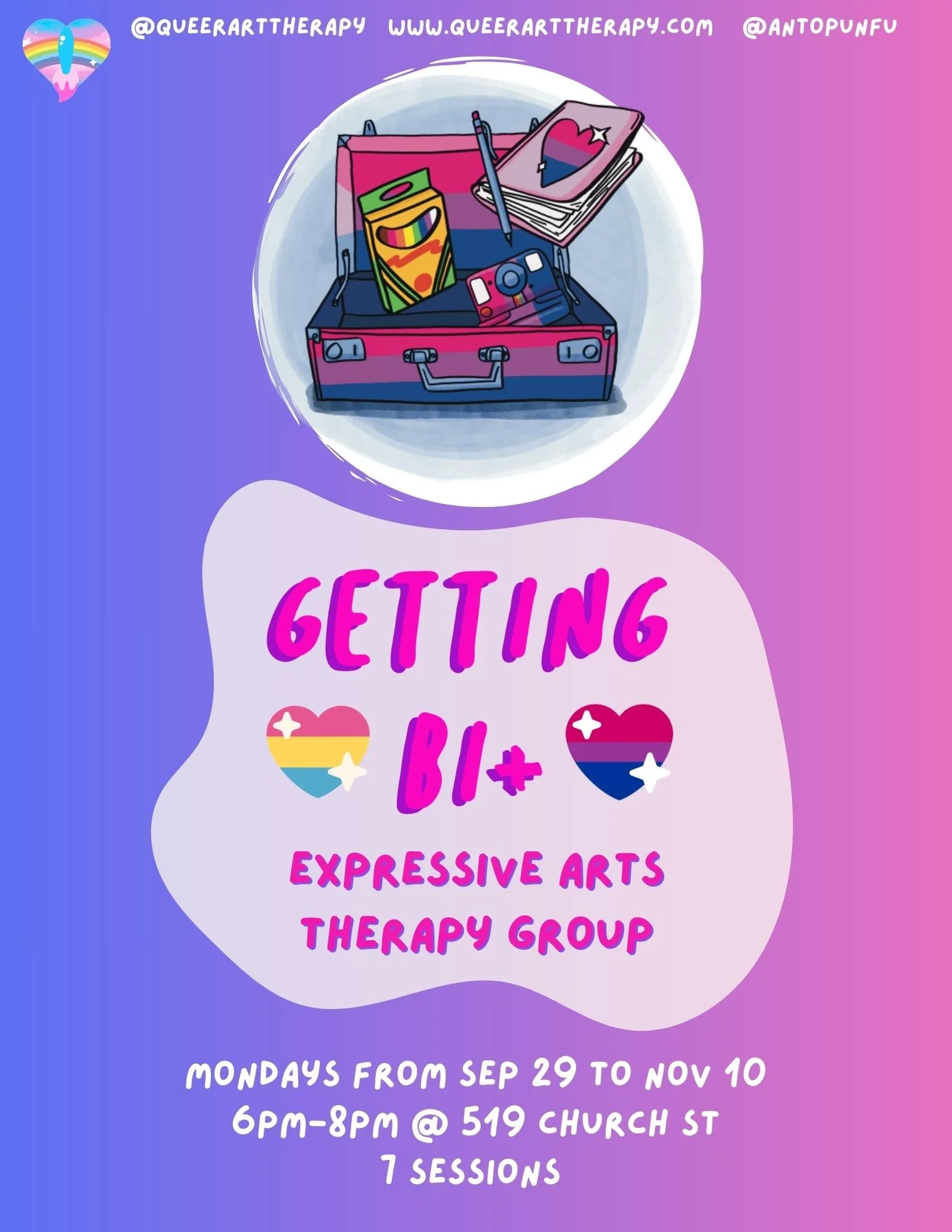 Getting Bi+ is a 7-week expressive arts therapy group created to celebrate identity, engage creatively in community, and explore challenges that come with bisexuality, pansexuality, questioning and multi-gender attraction, whatever part of the journey you are at.